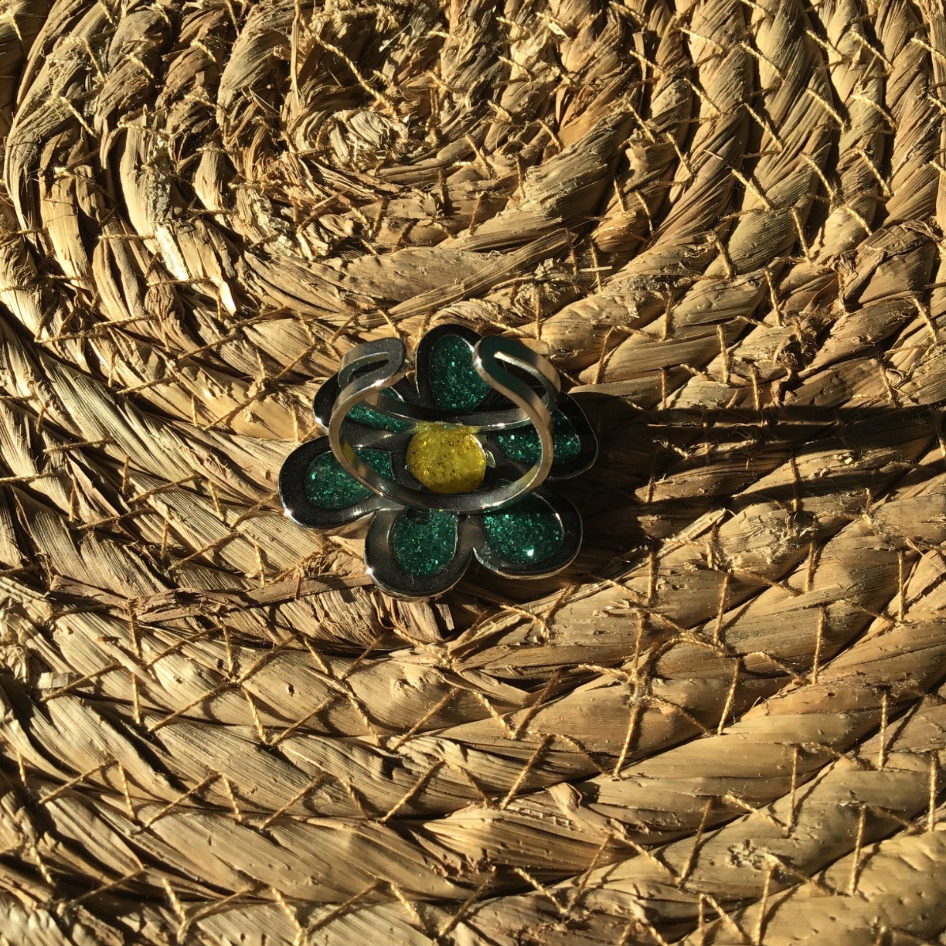 Bague fleur réglable, alliant acier inoxydable résistant et résine pétillante verte et jaune.