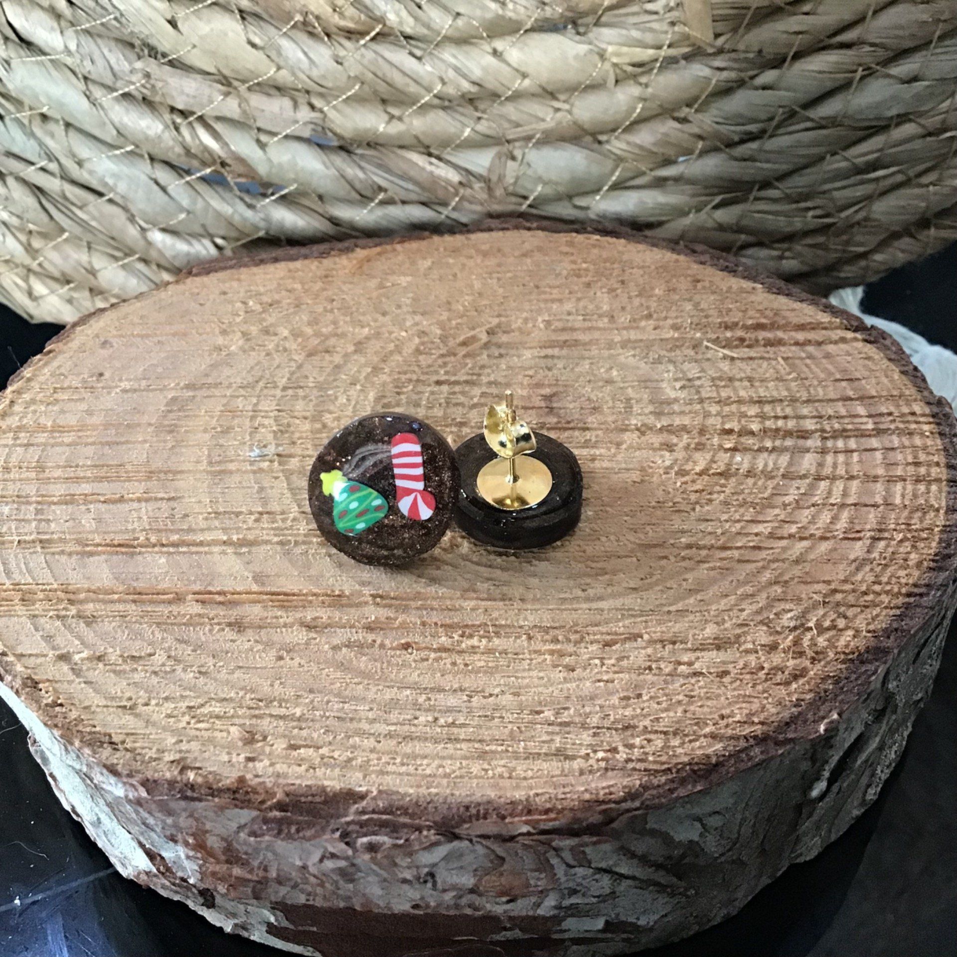 Deux symboles de Noël sur un écrin marron étoilé : le sapin pétillant et la chaussette généreuse.