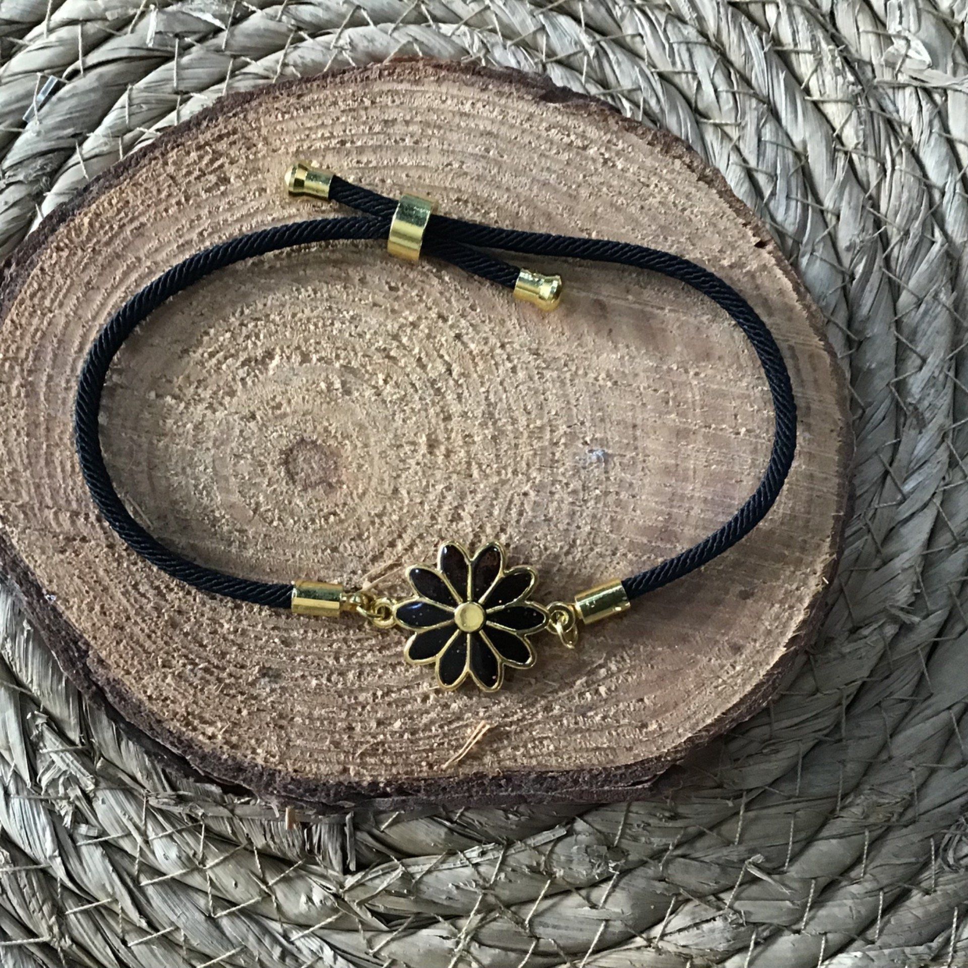 Un bracelet réglable aux reflets de nuit, où une fleur dorée s'épanouit dans l'obscurité . Ses pétales noirs, illuminés d'or, captent la lumière comme une étoile discrète. Un bijou qui danse entre ombre et éclat, pour sublimer chaque instant.