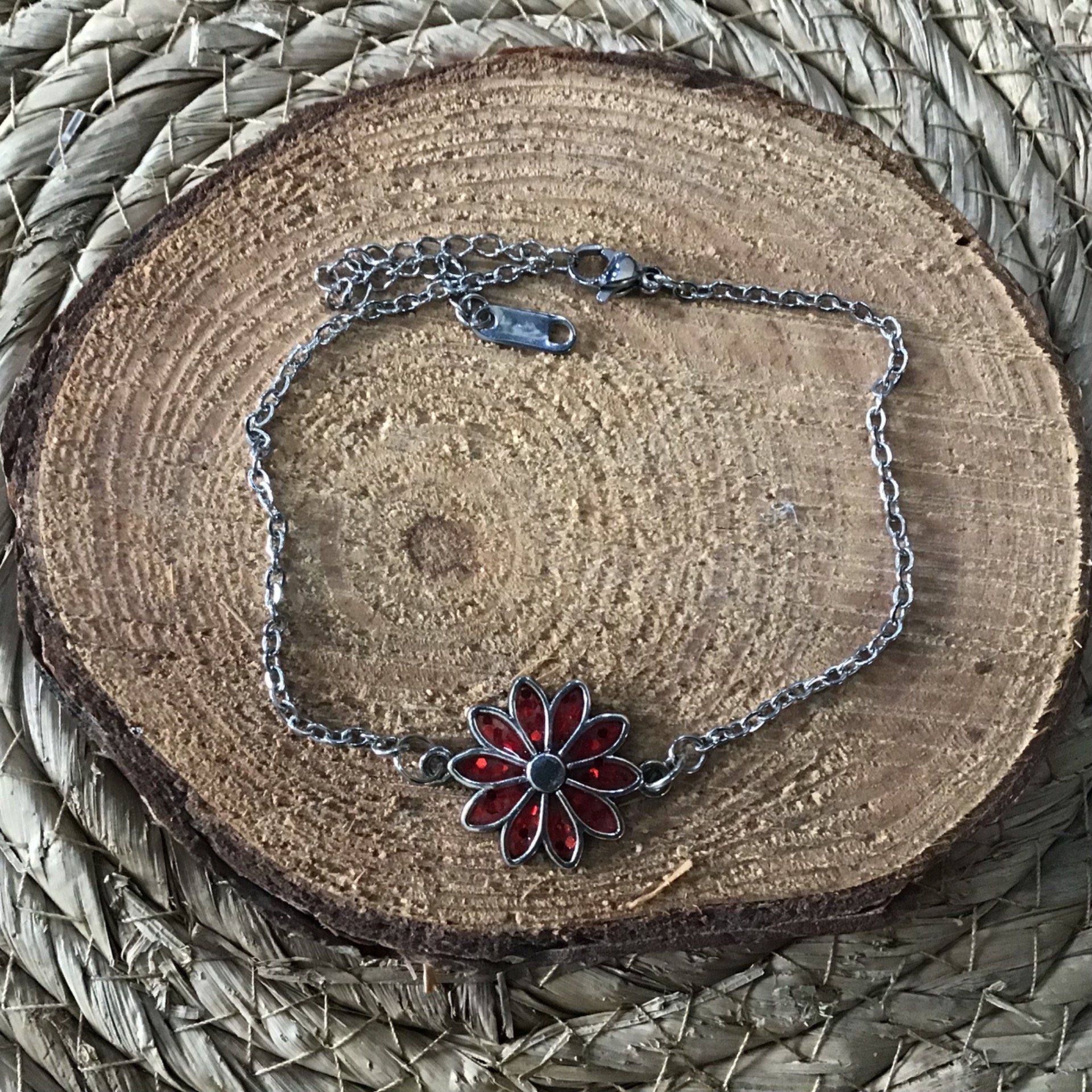 Un bracelet réglable aux reflets de nuit, où une fleur dorée s'épanouit dans l'obscurité . Ses pétales rouges pailleté, illuminés d'or, captent la lumière comme une étoile discrète. Un bijou qui danse entre ombre et éclat, pour sublimer chaque instant.