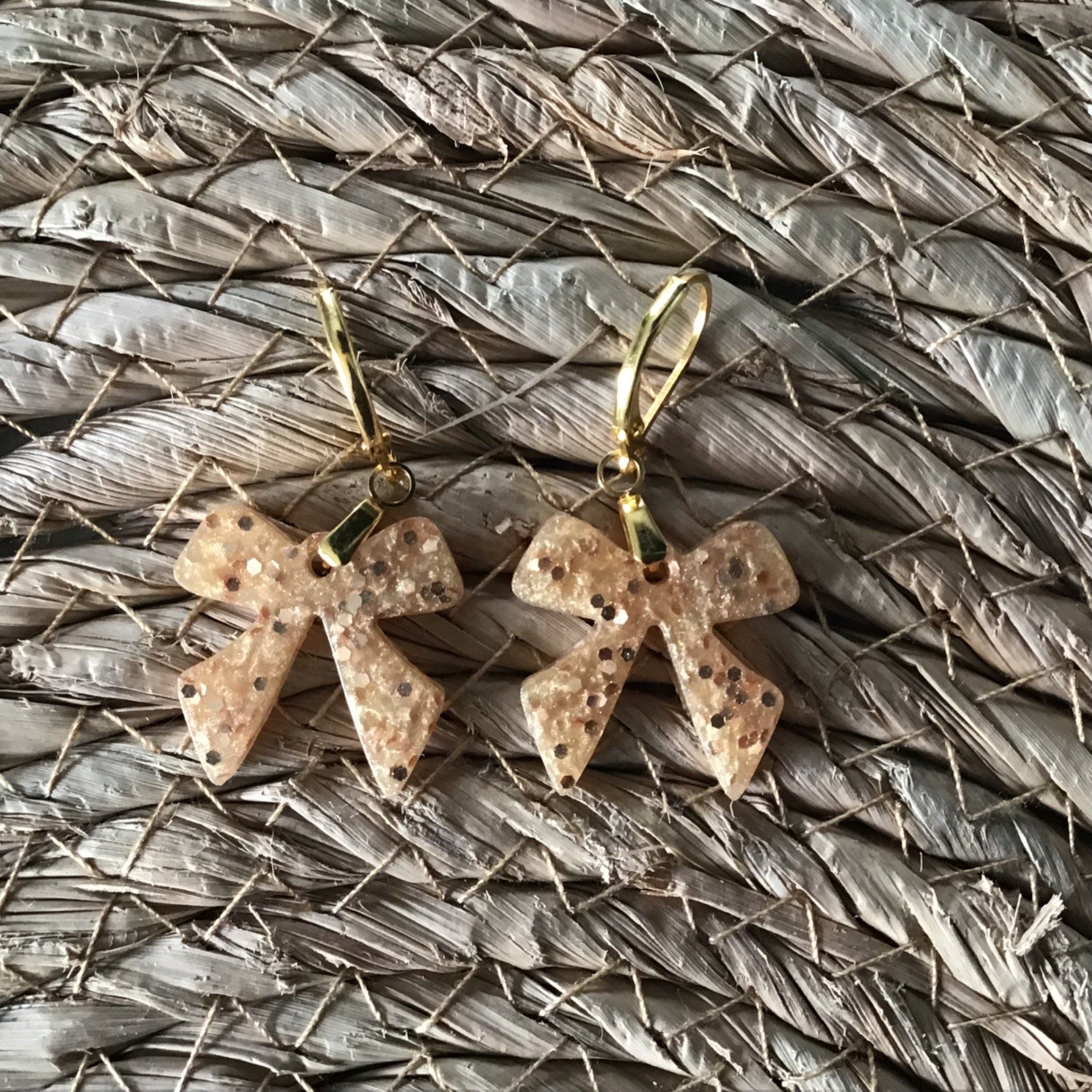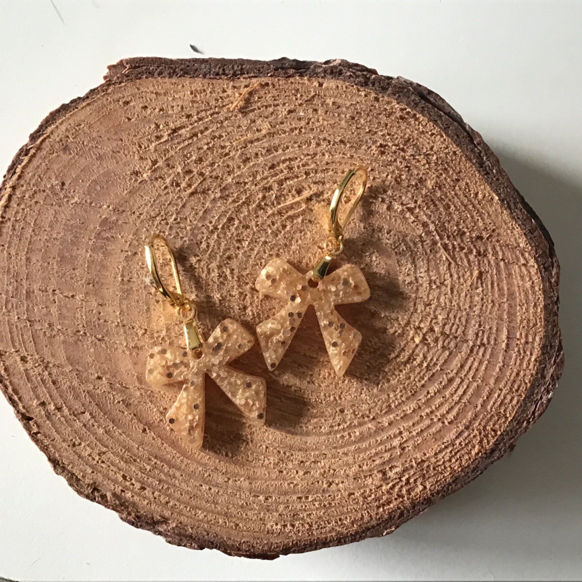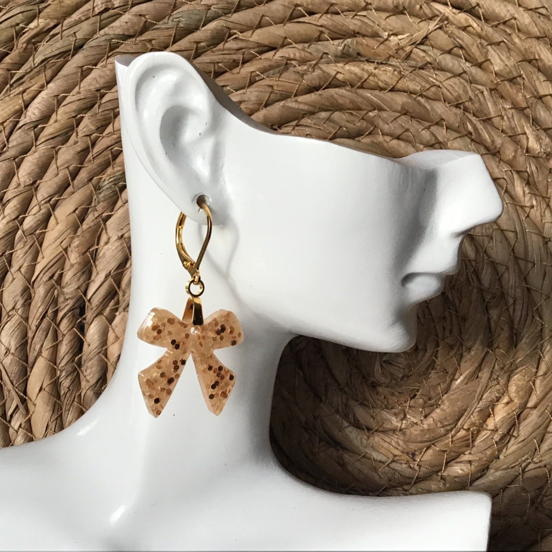 Ces boucles d'oreilles en forme de noeud papillon doré pailleté captent la lumière et l'élégance.