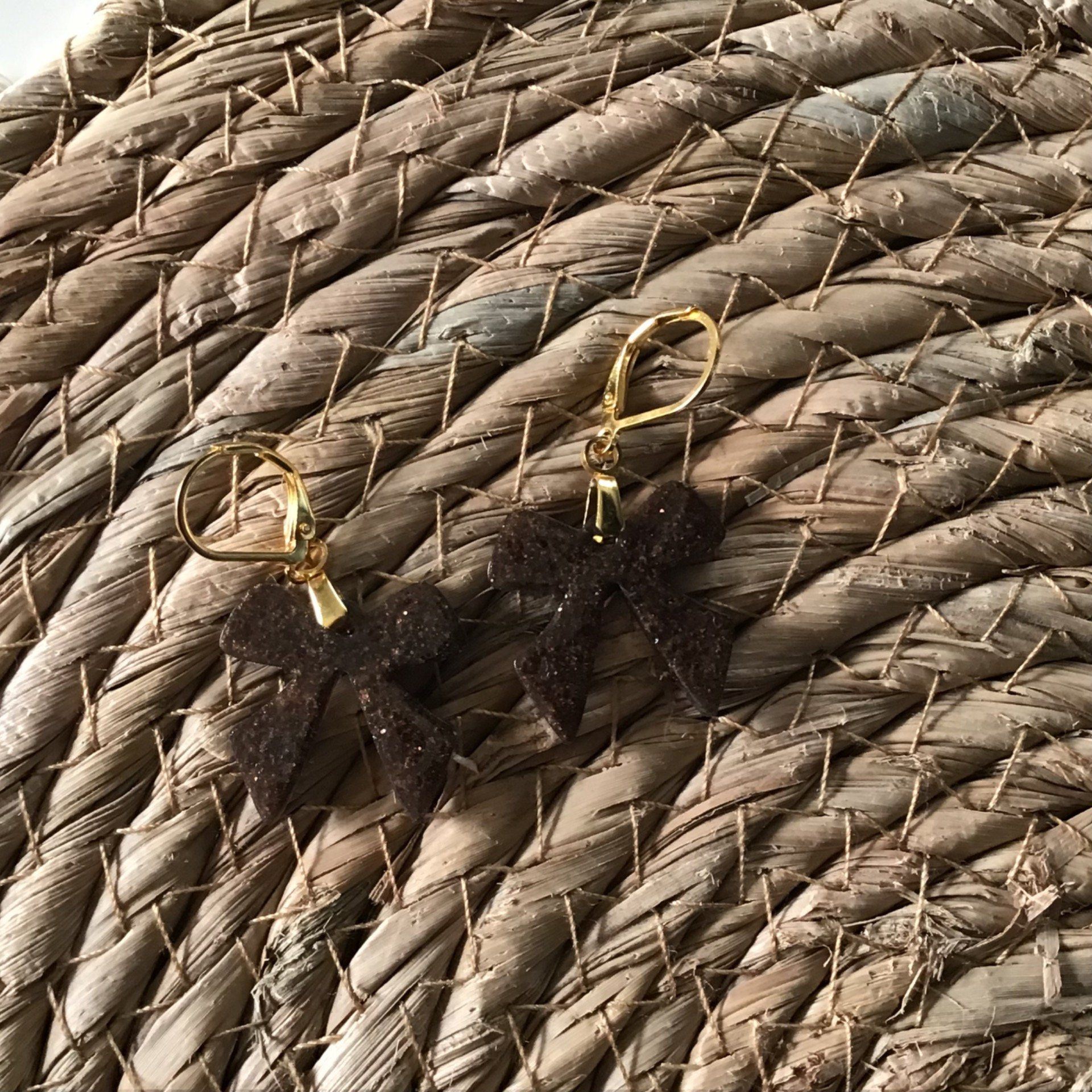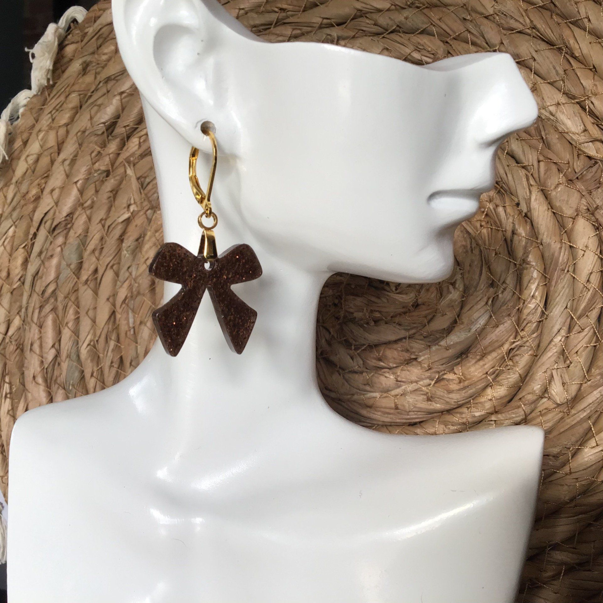 Ces boucles d'oreilles en forme de noeud papillon marron pailleté captent la lumière et l'élégance.